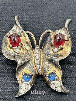 Very hard to find gold plated silver Trifari jeweled butterfly pin/brooch designed by Alfred Philippe in the 1940s. This was part of the Jewels Of India series that is so desirable. This measures 1 3/4" Height x 1 1/4" Width. Weight of brooch is 7.9g.